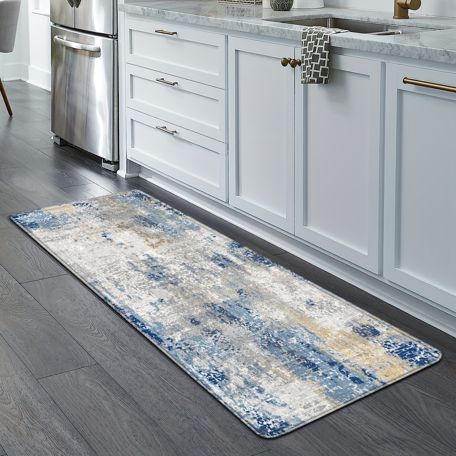 보헤미안 스타일 패턴 블루 부드러운 주방 매트 2개 세트, 흡수 및 미끄럼 방지, 미니멀리스트 스타일 1.2cm 두께의 스펀지 긴 바닥 매트, 거실/침실/욕실용 편안한 서서 사용